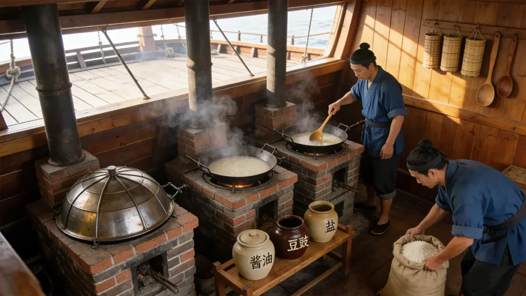 Even more vital were fermented foods: douchi (fermented black beans), soy sauce, and preserved tofu. High in protein, shelf-stable, and deeply savory, they turned bland rations into something bearable. Out on the open ocean, a spoonful of pungent fermented tofu might have felt like a shot of pure vitality—far more than any preserved ration could offer.